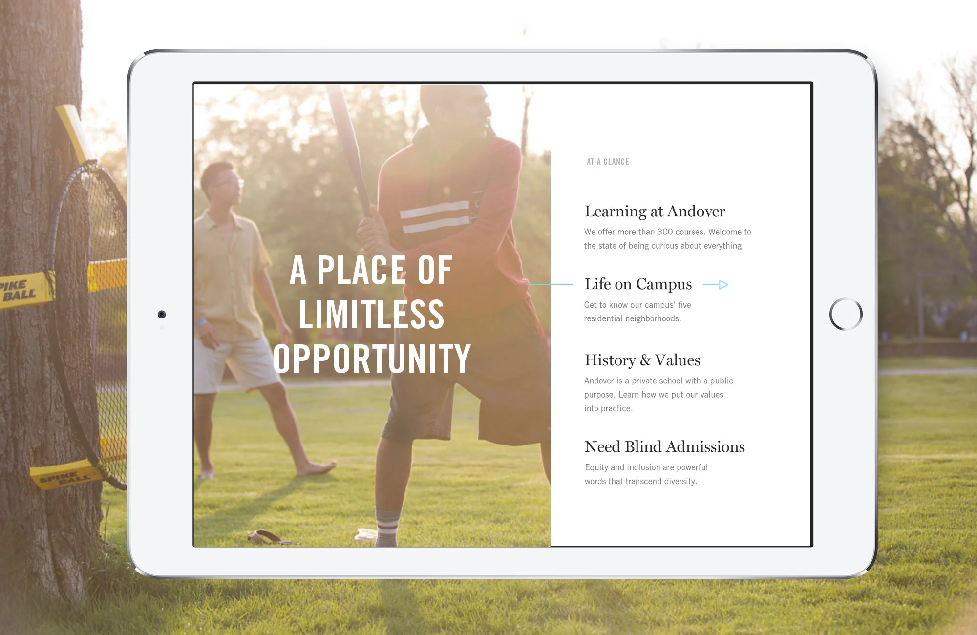 Beginning with the homepage, the website introduces the seemingly infinite paths of exploration that a student can take at Andover. Headshot "easter eggs" are placed throughout the site to reveal stories behind the images and show prospective students what their life might look like at Andover. We tested the design with current students as well as parents and alumni to make sure that we were accurately representing the institution.