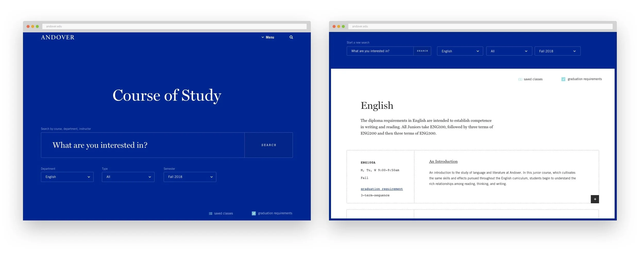 While working on the project I identified a need for a better way for students and prospectives to explore Andover's course offerings. Though not part of the original scope of work, I have been working on developing a concept for an interactive course catalogue allowing students to explore courses, instructors, and enter their information to see their graduation requirements. The concept also explores allowing users to save courses as they search.